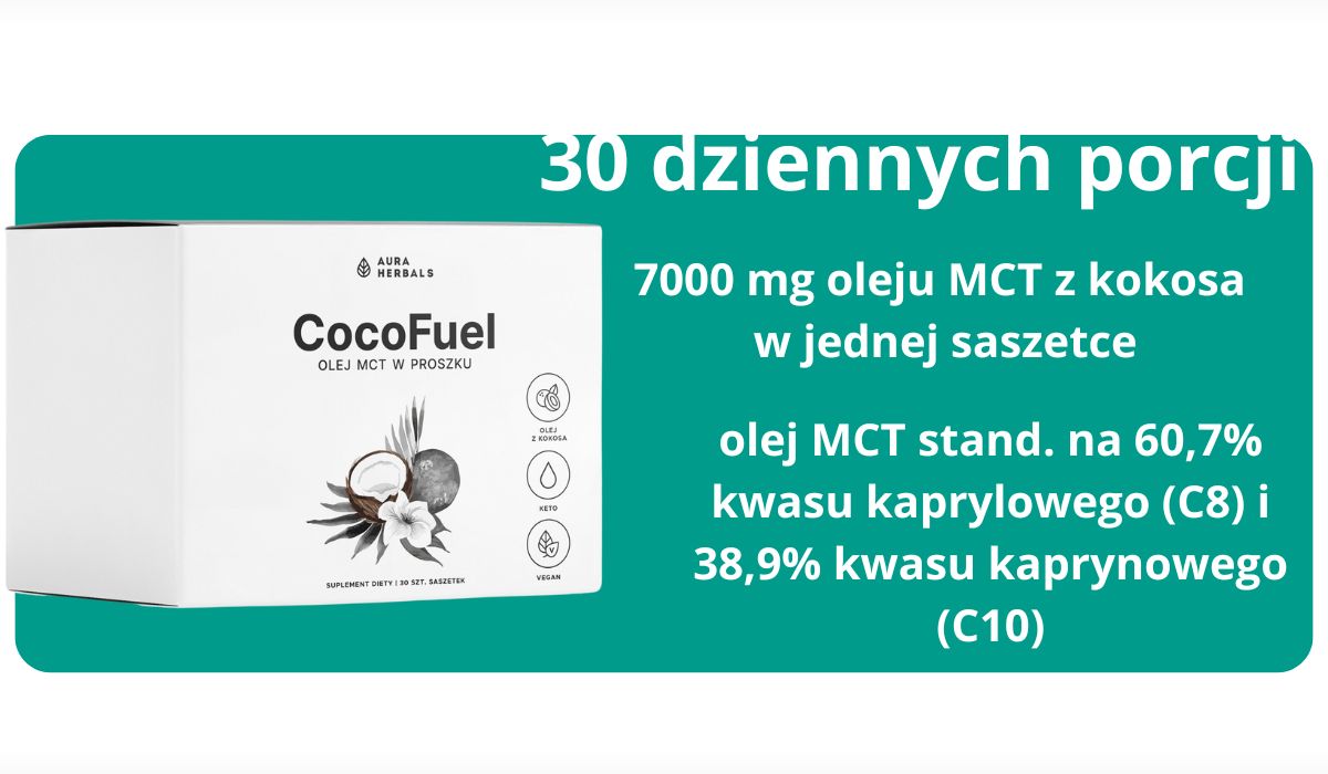 Aura Herbals Coco Fuel to olej MCT w postaci proszku zamknięty w poręcznych saszetkach. Dzięki temu możesz łatwo dodać go do swojego ulubionego napoju czy posiłku niezależnie od miejsca i czasu. To doskonałe rozwiązanie dla osób prowadzących aktywny tryb życia, które chcą w prosty sposób wzbogacić swoją dietę o cenne kwasy tłuszczowe.