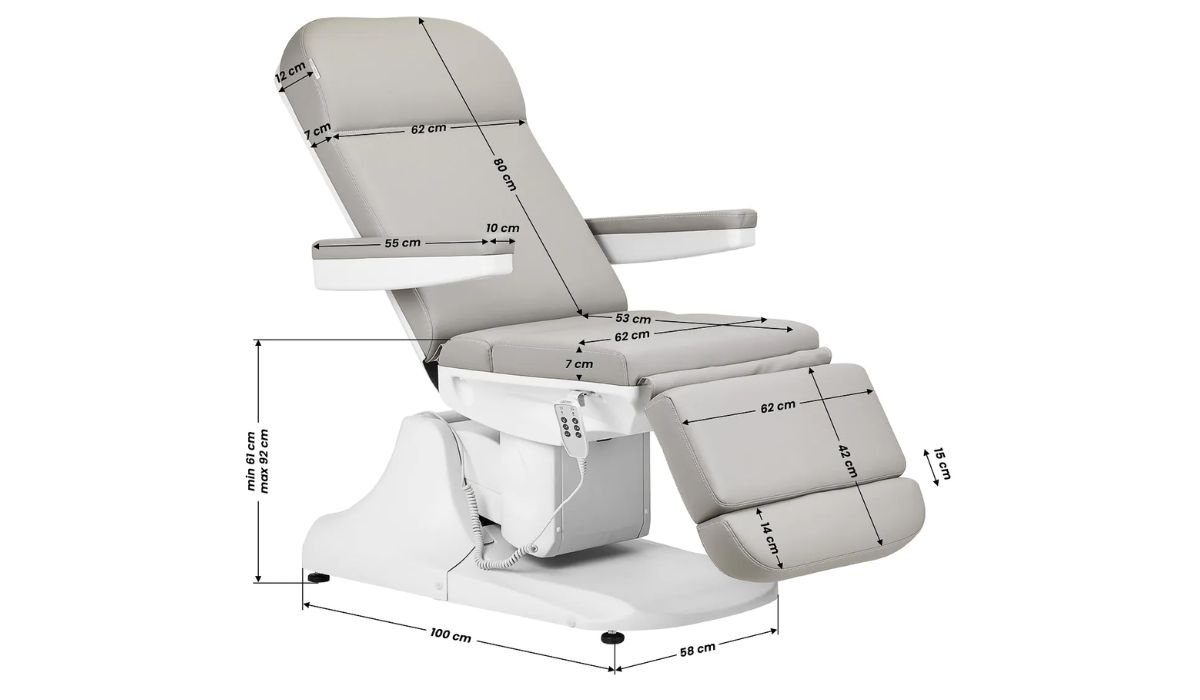 - Ruchome podłokietniki – ułatwiają przygotowanie klienta i dostęp do stref zabiegowych.