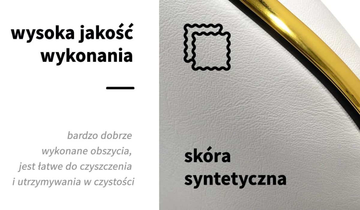 To nie tylko narzędzie pracy, ale również ozdoba każdego gabinetu kosmetycznego. Obicie wykonane z wysokiej jakości skóry syntetycznej dostępne jest w bieli lub czerni, dzięki czemu łatwo dopasujesz mebel do wystroju wnętrza. Dodatkowo, lakierowane złote elementy nadają całości luksusowego wyglądu, podkreślając prestiżowy charakter salonu. Pięcioramienna podstawa zapewnia stabilność, a trwałe kółka ułatwiają płynne poruszanie się po przestrzeni bez konieczności wstawania – co sprawia, że praca staje się jeszcze bardziej dynamiczna i swobodna.
