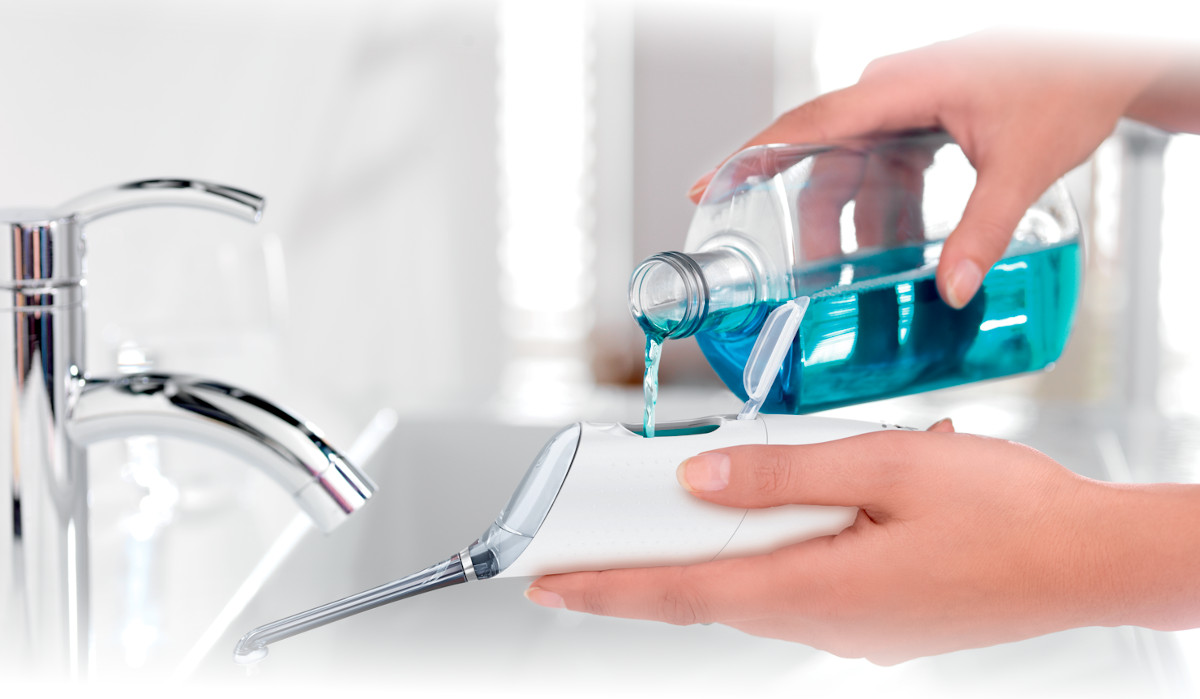 - Urządzenia AirFloss Ultra można używać z płynem do płukania jamy ustnej lub wodą